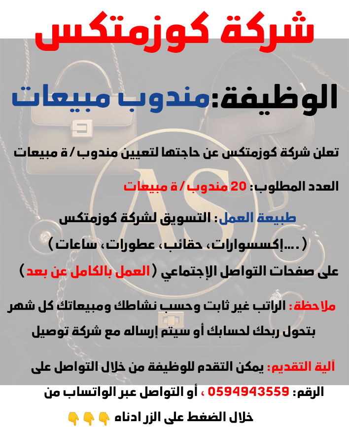 تعلن شركة كوزمتكس عن حاجتها لتعيين مندوب/ة مبيعاتالعدد المطلوب: 20 مندوب/ة مبيعاتطبيعة العمل: التسويق لشركة كوزمتكس (إكسسوارات، حقائب، عطورات، ساعات….) على صفحات التواصل الإجتماعي (العمل بالكامل عن بعد)ملاحظة: الراتب غير ثابت وحسب نشاطك ومبيعاتك كل شهر بتحول ربحك لحسابك أو سيتم إرساله مع شركة توصيلآلية التقديم: يمكن التقدم للوظيفة من خلال التواصل على الرقم: 0594943559 📞 ، أو التواصل عبر الواتساب من خلال الضغط على الزر ادناه 👇👇👇وظائف فلسطين... بِكُم نَّكبَر