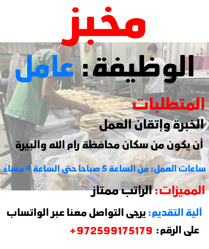 📢 يعلن مخبز في مدينة رام الله عن حاجته لتعيين عامل تصفيط خبز 📌 الشروط المطلوبة:• الخبرة وإتقان العمل• أن يكون من سكان محافظة رام الله والبيرة📌 ساعات العمل: من الساعة ٥ صباحاََ حتى الساعة ٤ مساءََ📌 المميزات:• الراتب ممتاز 📍 آلية التقديم: يمكنكم التواصل عبر الواتساب على الرقم: 972599175179+ ، أو الاتصال على الرقم التالي: 0599175179