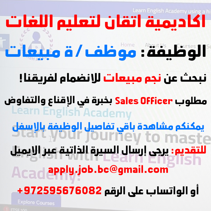 فرصة عمل: موظف/ة مبيعات نبحث عن نجم مبيعات للانضمام لفريقنا !📢 مطلوب Sales Officer بخبرة في الإقناع والتفاوضوصف الوظيفة:• نبحث عن موظف/ة سيلز شاطر/ة وطموح/ة للانضمام إلى فريقنا، يكون عنده مهارة عالية في التواصل والإقناع، وقادر على تحقيق الأهداف البيعية وبناء علاقات ممتازة مع العملاء.المهام:• التواصل مع العملاء وشرح الخدمات بوضوح واحترافية• متابعة العملاء وإغلاق الصفقات• تحقيق التارجت الشهري• تحديث بيانات العملاء والتقاريرالمتطلبات:• خبرة في مجال المبيعات في تعليم اللغات اونلاين (ويُفضّل السيلز الهاتفي )• شخصية لبقة وقدرة عالية على الإقناع• الالتزام والانضباط في العمل• روح الفريق والطموح للتطوّرالمزايا:• راتب + عمولات مجزية• بيئة عمل داعمة• فرص تطوير وترقية📍 للتقديم: يرجى إرسال السيرة الذاتية عبر الايميل: apply.job.bc@gmail.com 📩أو الواتساب على الرقم: 972595676082+ 📱